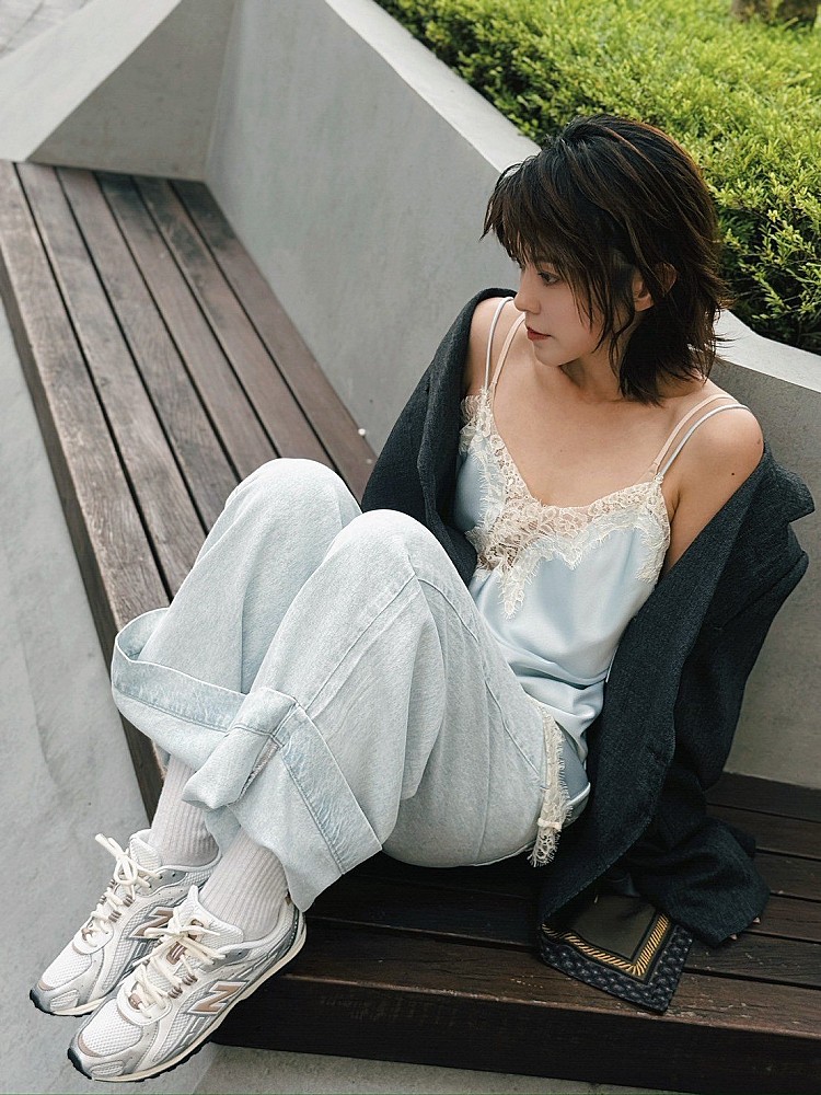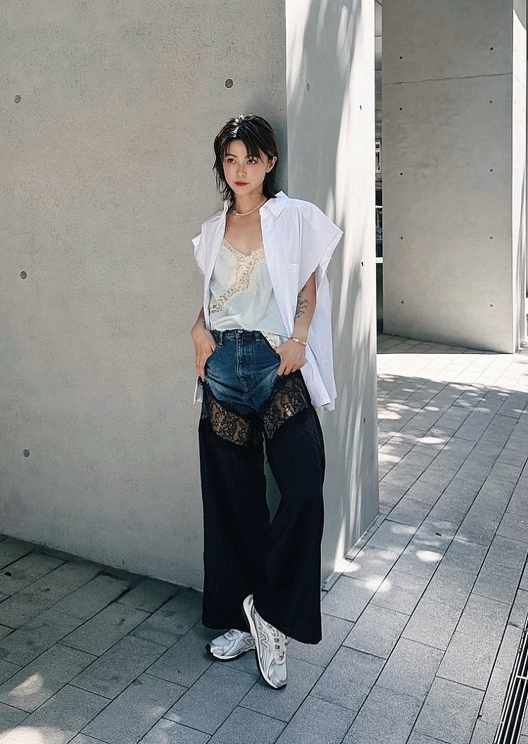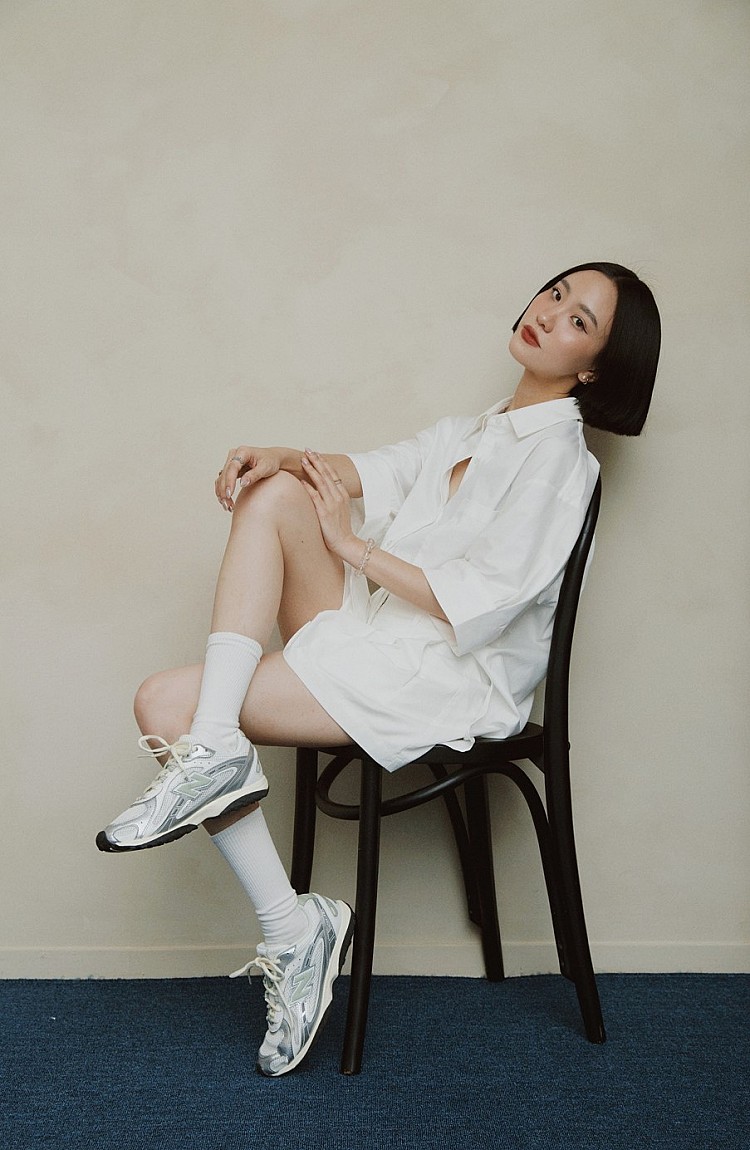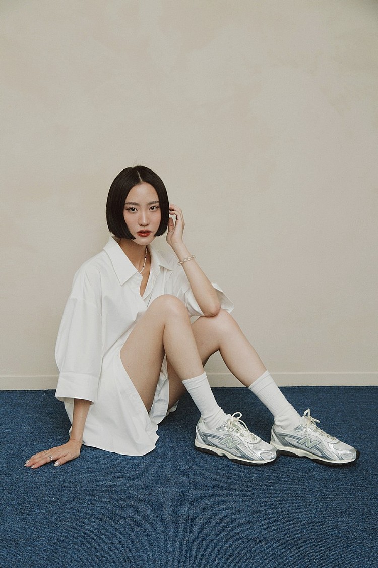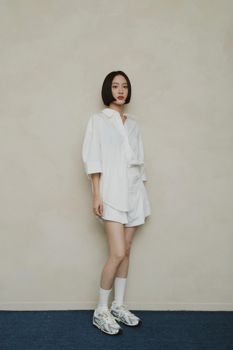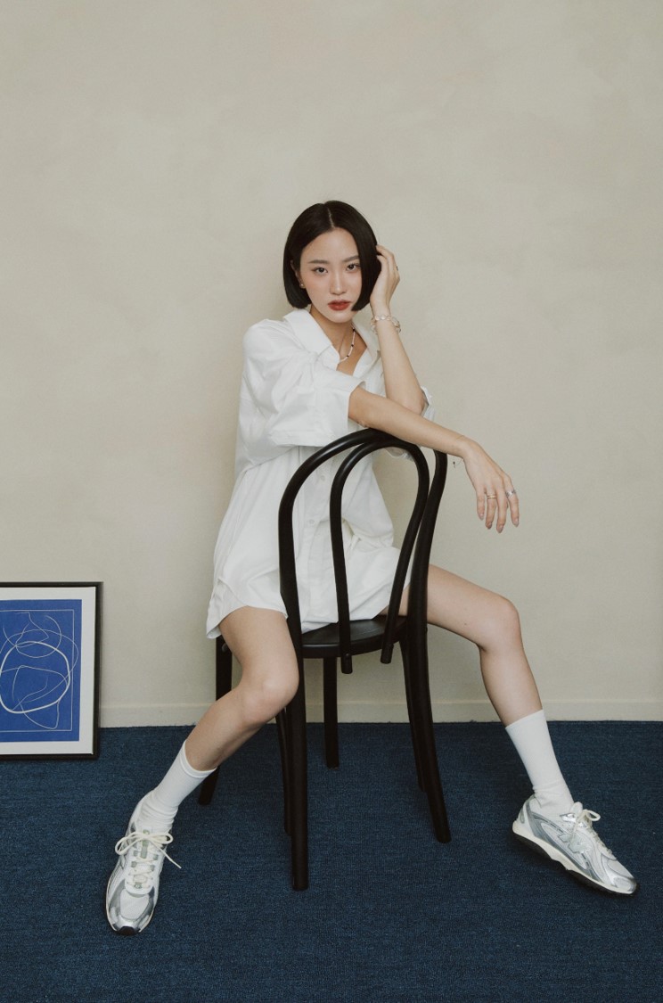身為新銳女裝品牌主理人、同時也擁有倫敦時尚行銷/時尚品牌公關背景的 YI LU盧,對風格與品質的選品一向秉持高標準,這也反映在她的穿搭美學中。她經常在社群分享親自挖掘的寶藏單品,而204L當然也入選其中。極簡鞋型與 YI LU 盧一貫的穿搭風格不謀而合。這次,她以純白襯衫搭配短褲,演繹出輕盈精緻的造型,並將焦點聚集在鞋款上。204L以具未來感的銀色流線飾邊設計,增添一股Y3K美感;搭配網布等異材質拼接,不刻意卻畫龍點睛,恰如其分地體現她對穿搭細節的高要求。