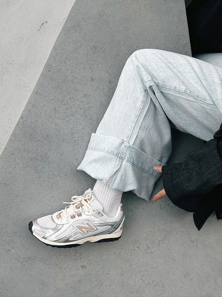全新204L融合復古慢跑鞋輪廓與現代設計語彙,以時下火紅的金屬銀為鞋身基底,點綴上粉嫩寶寶藍,展現甜酷兼具的時髦魅力。正好與 Tiff 的深色系上身形成視覺上的「衝突美學」。不僅展現專業造型師對於鞋履搭配的高度掌握,也再次驗證 204L 已成為時尚圈不可忽視的腳上焦點。